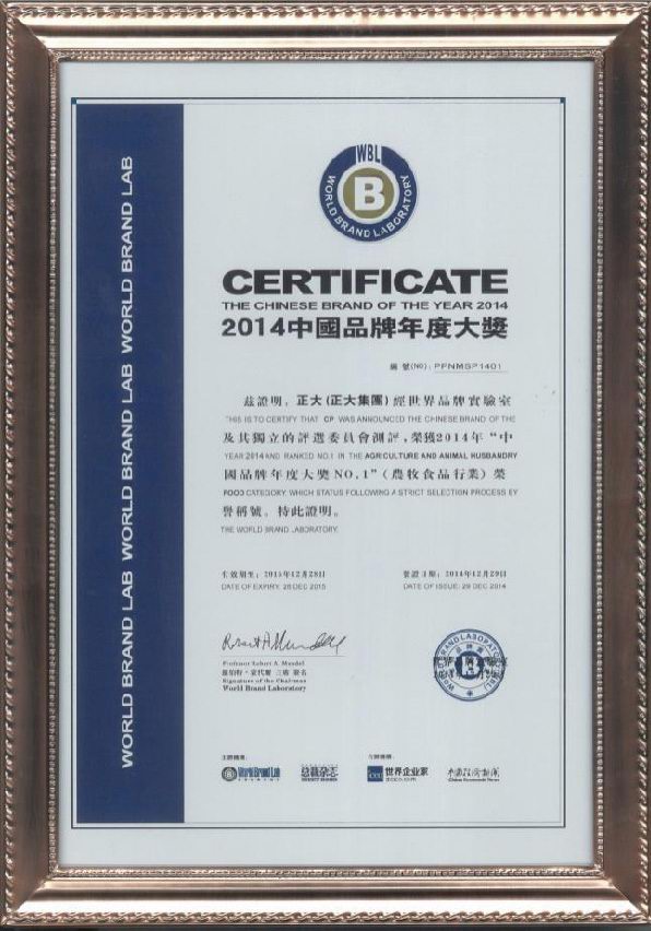 20141229日,總裁世界年會在北京東方君悅大酒店舉行。本次大會揭曉了享有中國品牌奧斯卡之稱的世界品牌實驗室2014年中國品牌年度大獎評選結(jié)果,正大集團、中國國航、國家電網(wǎng)、騰訊控股、中國人壽、中國國旅、北汽集團、華為技術(shù)、長虹電器等30個活躍在中國經(jīng)濟舞臺的領(lǐng)軍品牌榮獲中國品牌年度大獎,正大集團以在農(nóng)牧食品業(yè)多年的探索實踐和管理經(jīng)驗,以及良好的產(chǎn)品品質(zhì)和品牌知名度,榮獲農(nóng)牧食品行業(yè)中國品牌年度大獎***”榮譽稱號。哈佛商學(xué)院教授約翰?戴騰博士(John Deighton)、耶魯大學(xué)管理學(xué)院教授萊維·多爾博士(Ravi Dhar)分別進行頒獎及致詞。